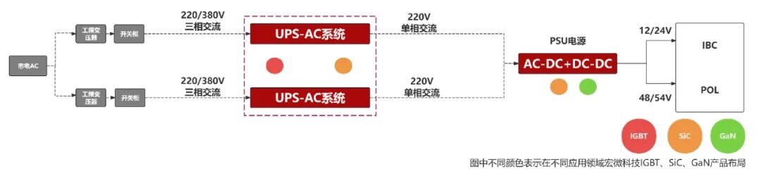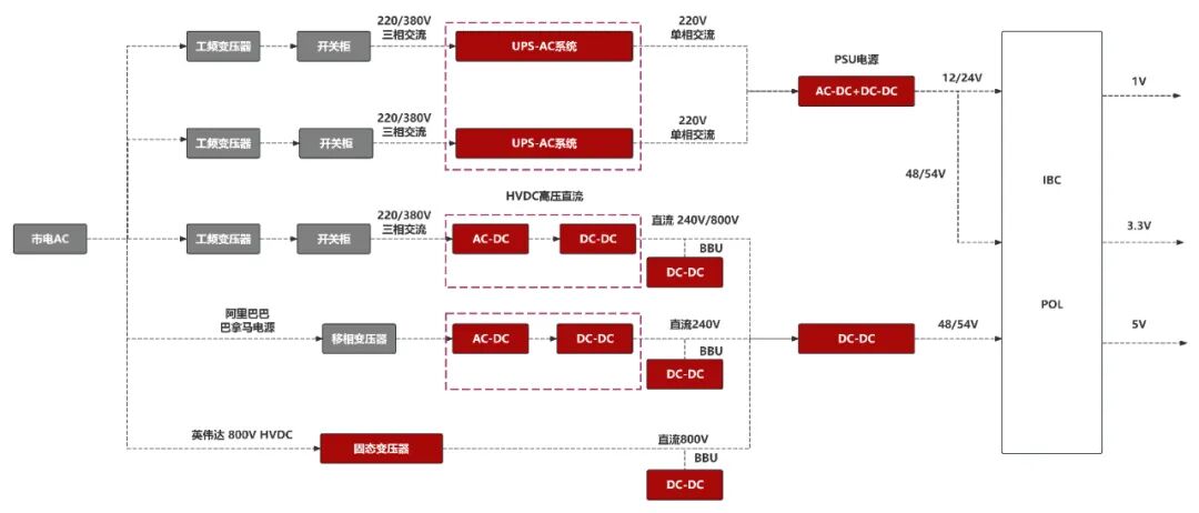 当前主流AIDC供电架构采用"交流变直流,电压逐步降"模式:电网10kV-20kV高压交流电经变压器降至380V三相交流,再通过不间断电源(UPS)和服务器电源(PSU)转换为48V/12V直流。